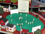 and still runs beautifully. In the corner Dave White and his wife Karen and son Thomas set up a fantastic 11’ x 7’ Tri-ang super4 layout with Minic motorway crossing the track twice with cars stopping for the trains, Model land and Arkitex. This layout also had my adapted Subutteo cricket team which blended in well with the model land buildings. The Subutteo figures were modelled by the same person who made the model land figures so they fit in well on a Tri-ang layout.