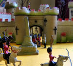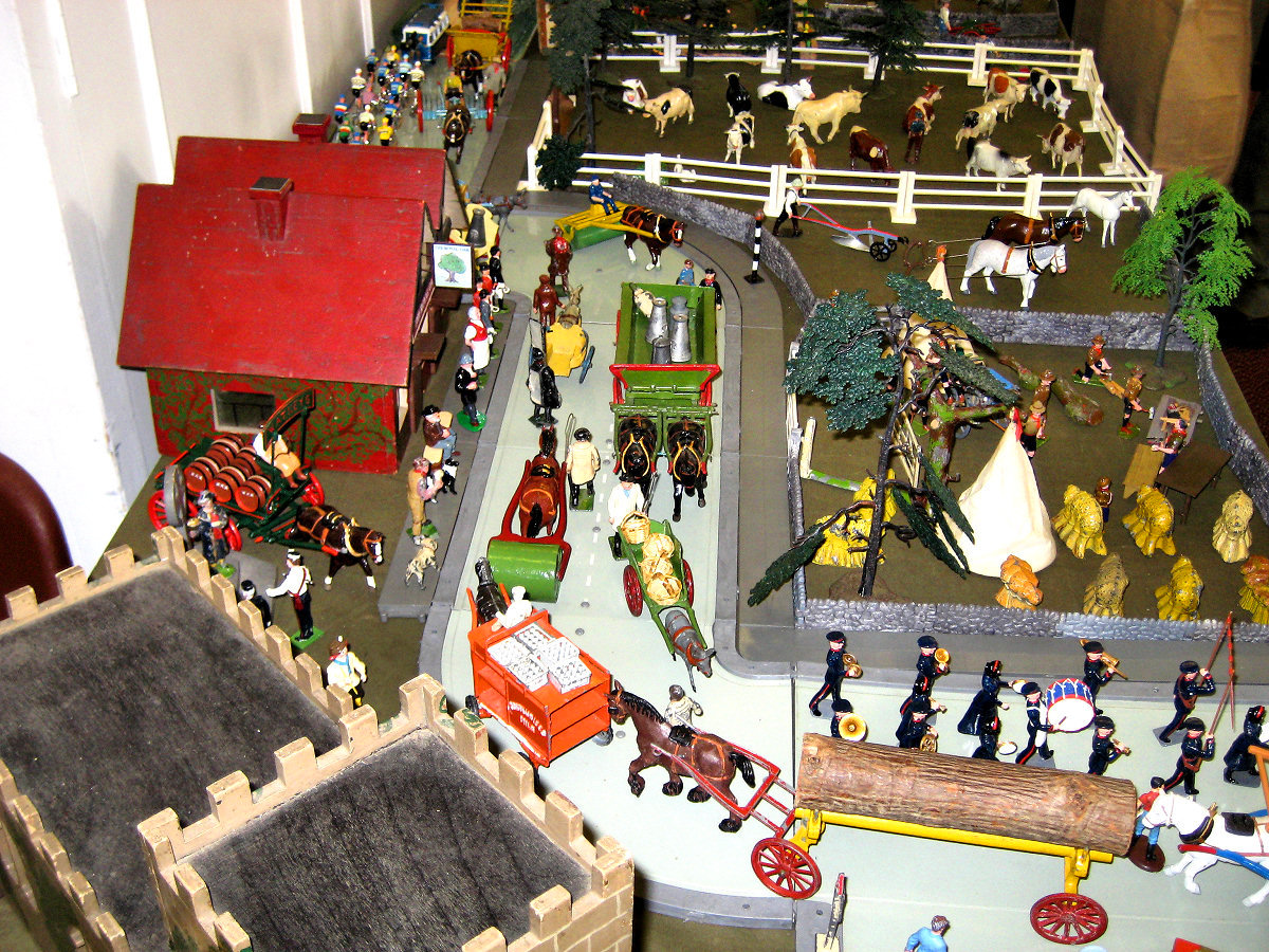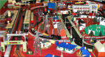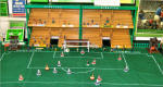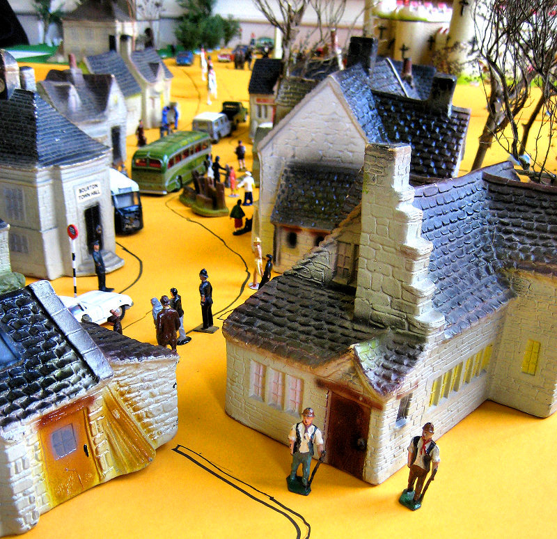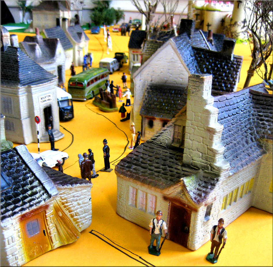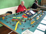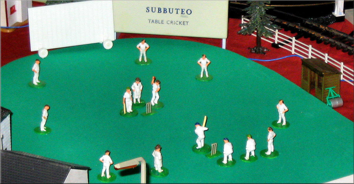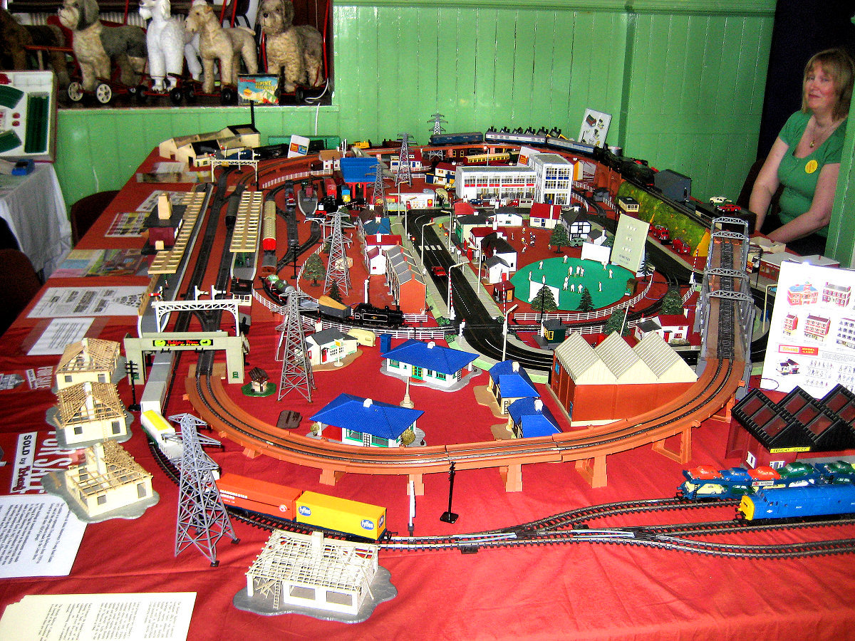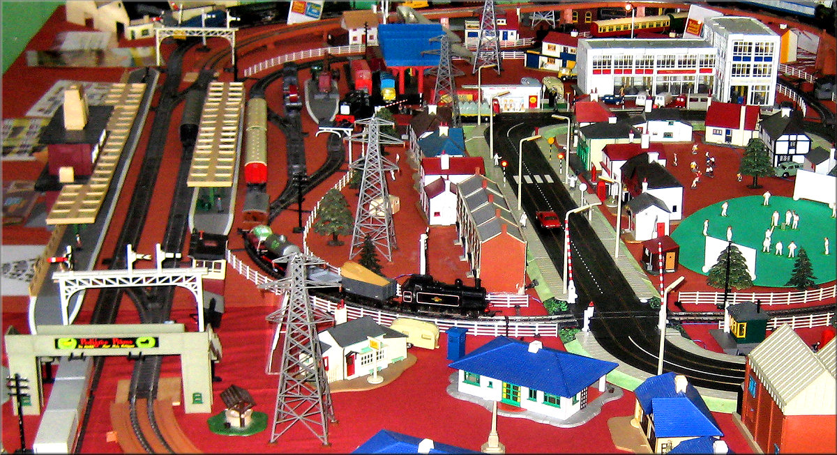 and still runs beautifully. In the corner Dave White and his wife Karen and son Thomas set up a fantastic 11’ x 7’ Tri-ang super4 layout with Minic motorway crossing the track twice with cars stopping for the trains, Model land and Arkitex. This layout also had my adapted Subutteo cricket team which blended in well with the model land buildings. The Subutteo figures were modelled by the same person who made the model land figures so they fit in well on a Tri-ang layout.