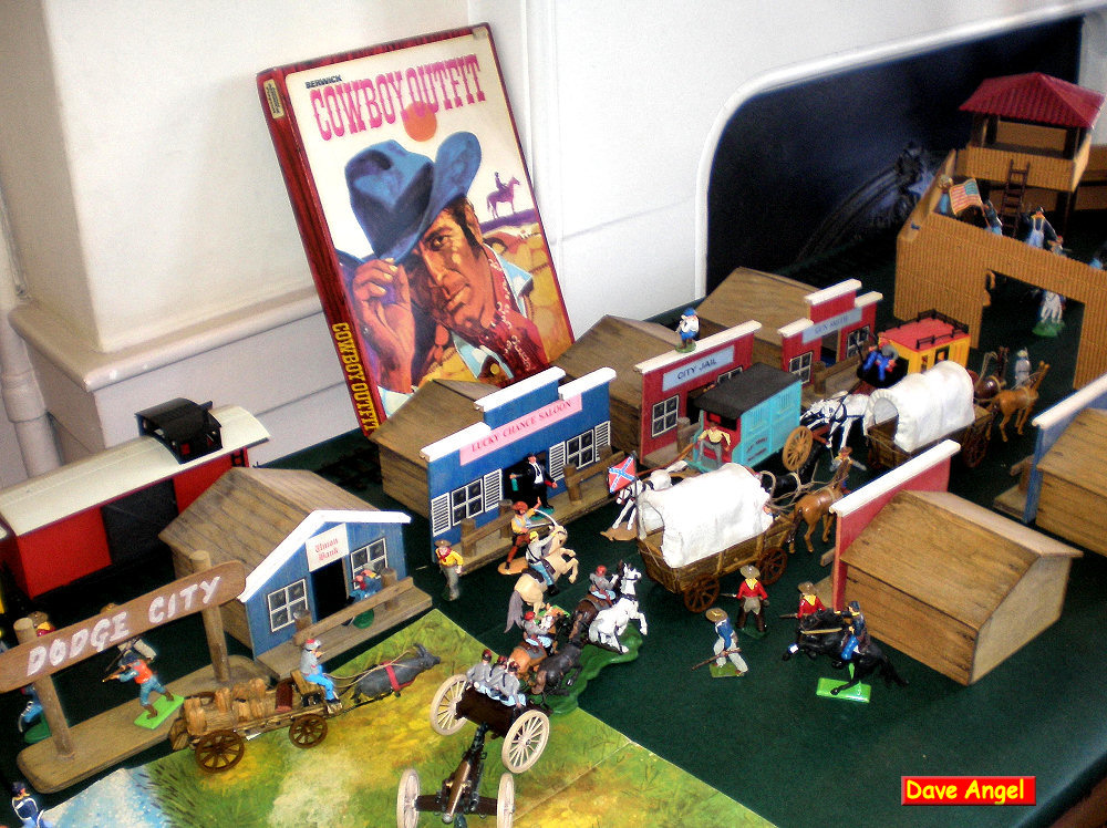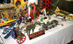 Dodge City, In the corner of the back wall was a small display of Corgi, Dinky and Matchbox toy cars, A London Double deck bus collection was also popular and included a large Tri-ang sit on bus. The rest of the back wall was Adam Heeley’s lovely display of Britains Farm series from pre war up to the 70’s. This was a very impressive display and also included a Scout camp and Salvation Army band. In addition there was a Tour de France of 20+ cyclists (unknown maker) and a Britains Fox Hunt set.